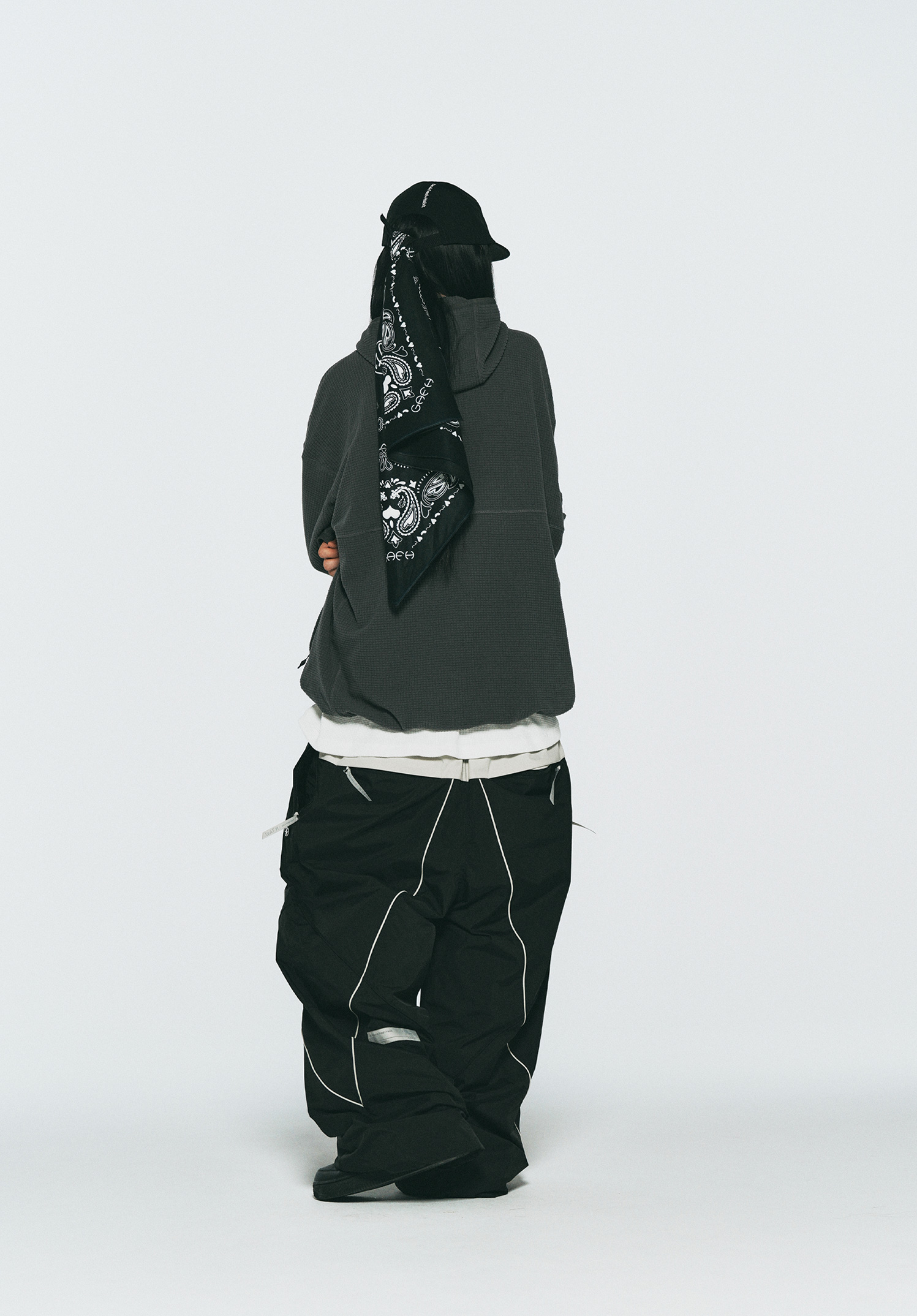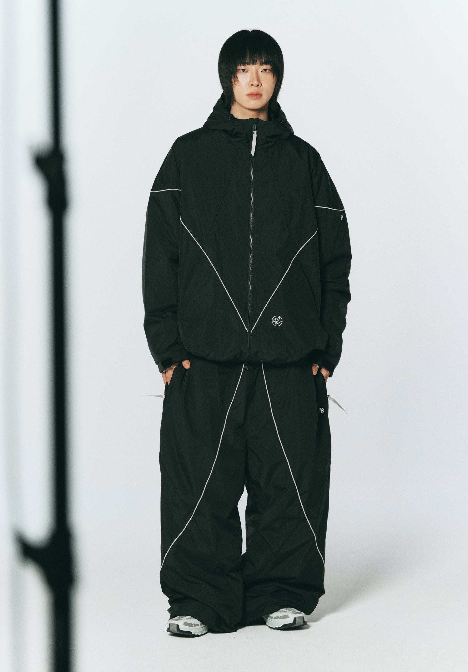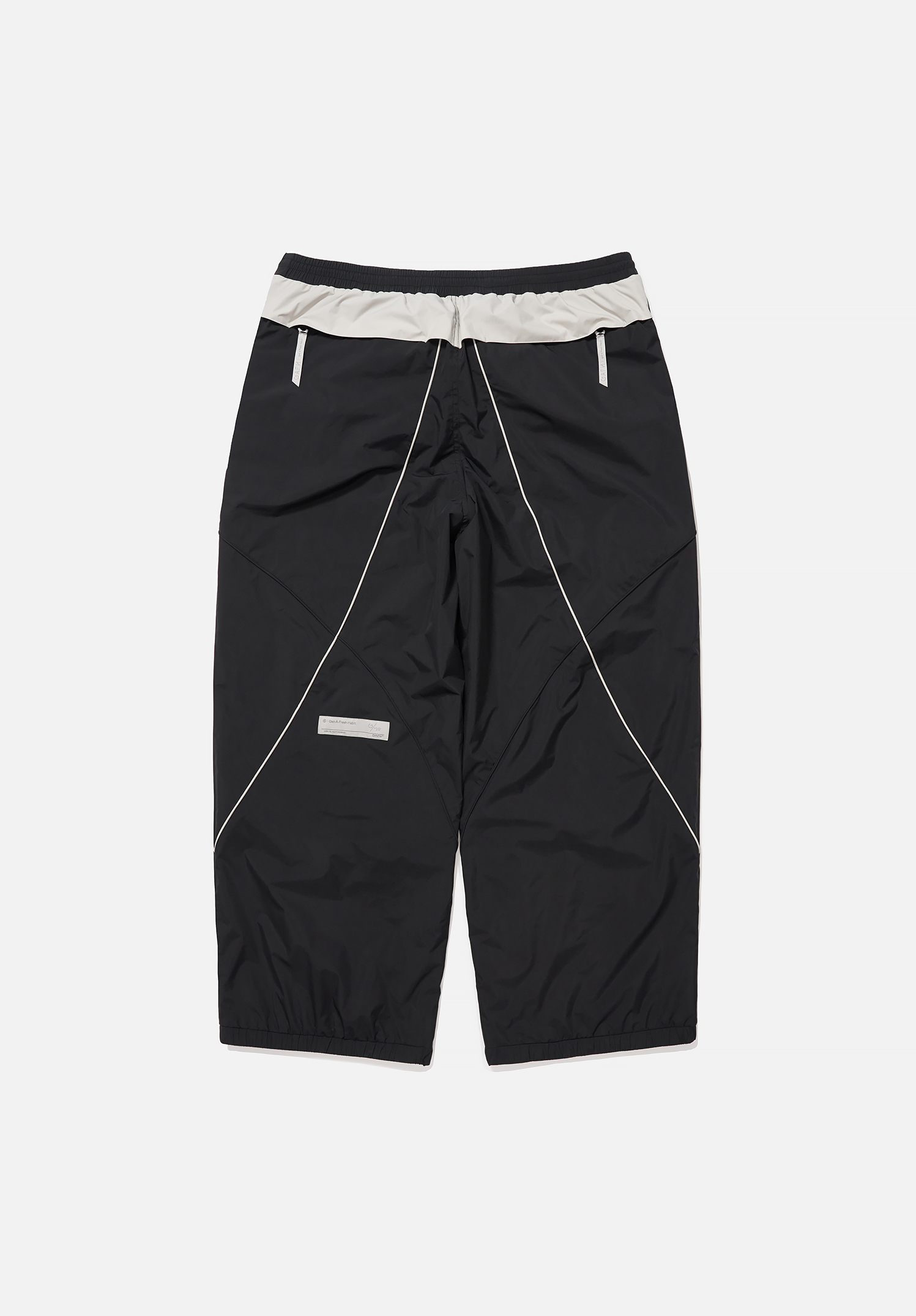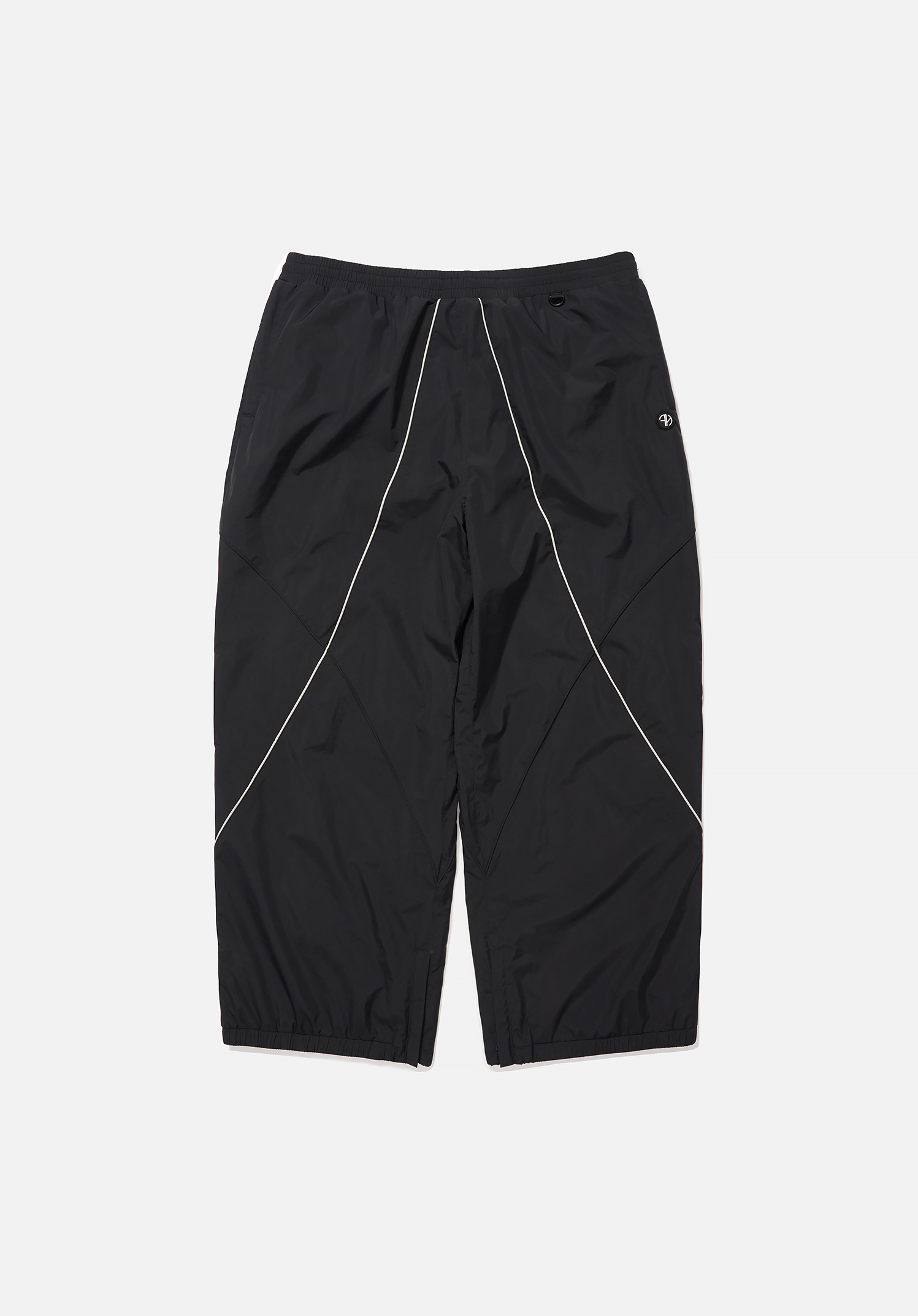 기능성 NYLON 소재를 사용한 와이드 핏의 팬츠로, 배색 파이핑 디테일로 포인트를 주었습니다.