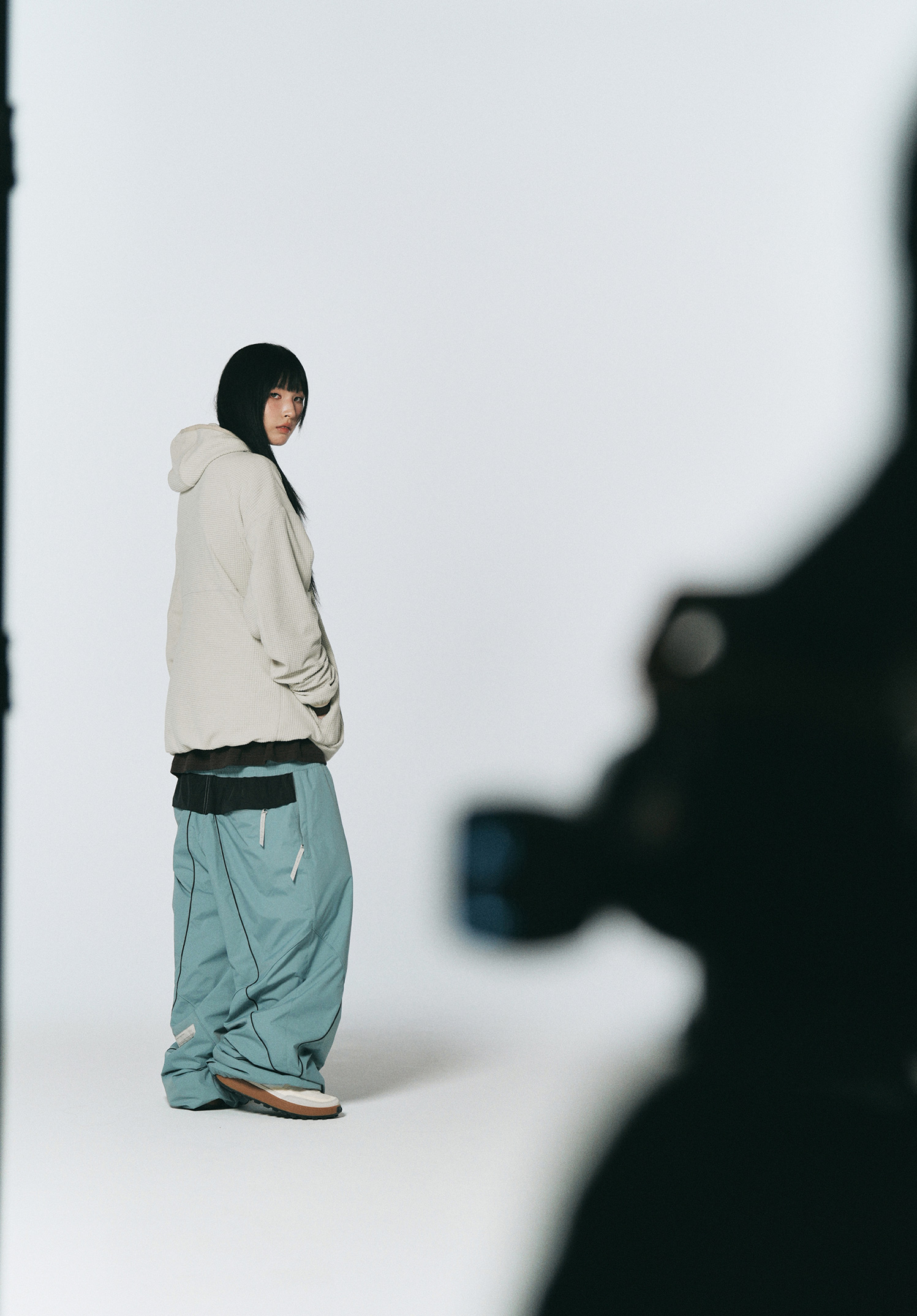 기능성 NYLON 소재를 사용한 와이드 핏의 팬츠로, 배색 파이핑 디테일로 포인트를 주었습니다.