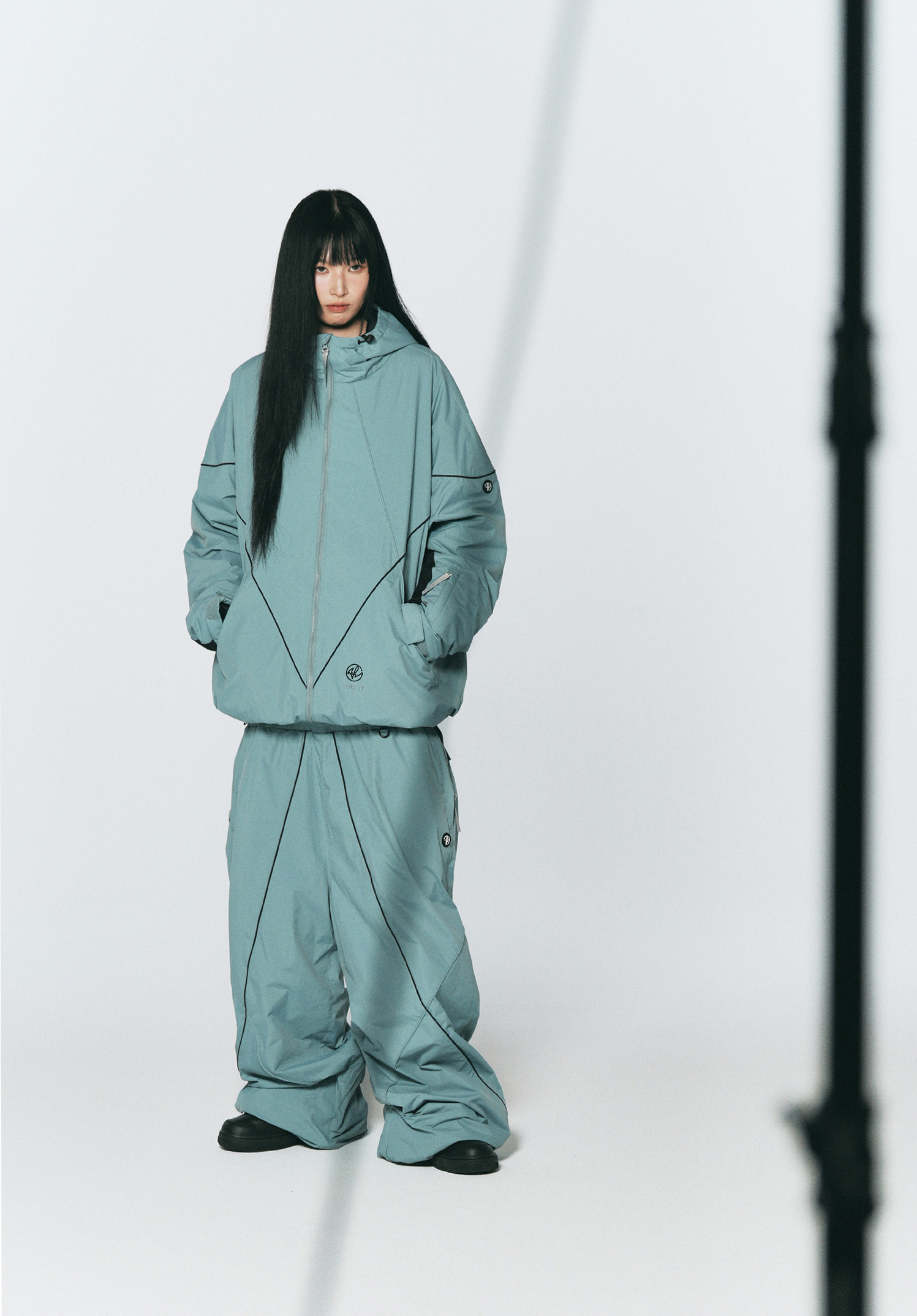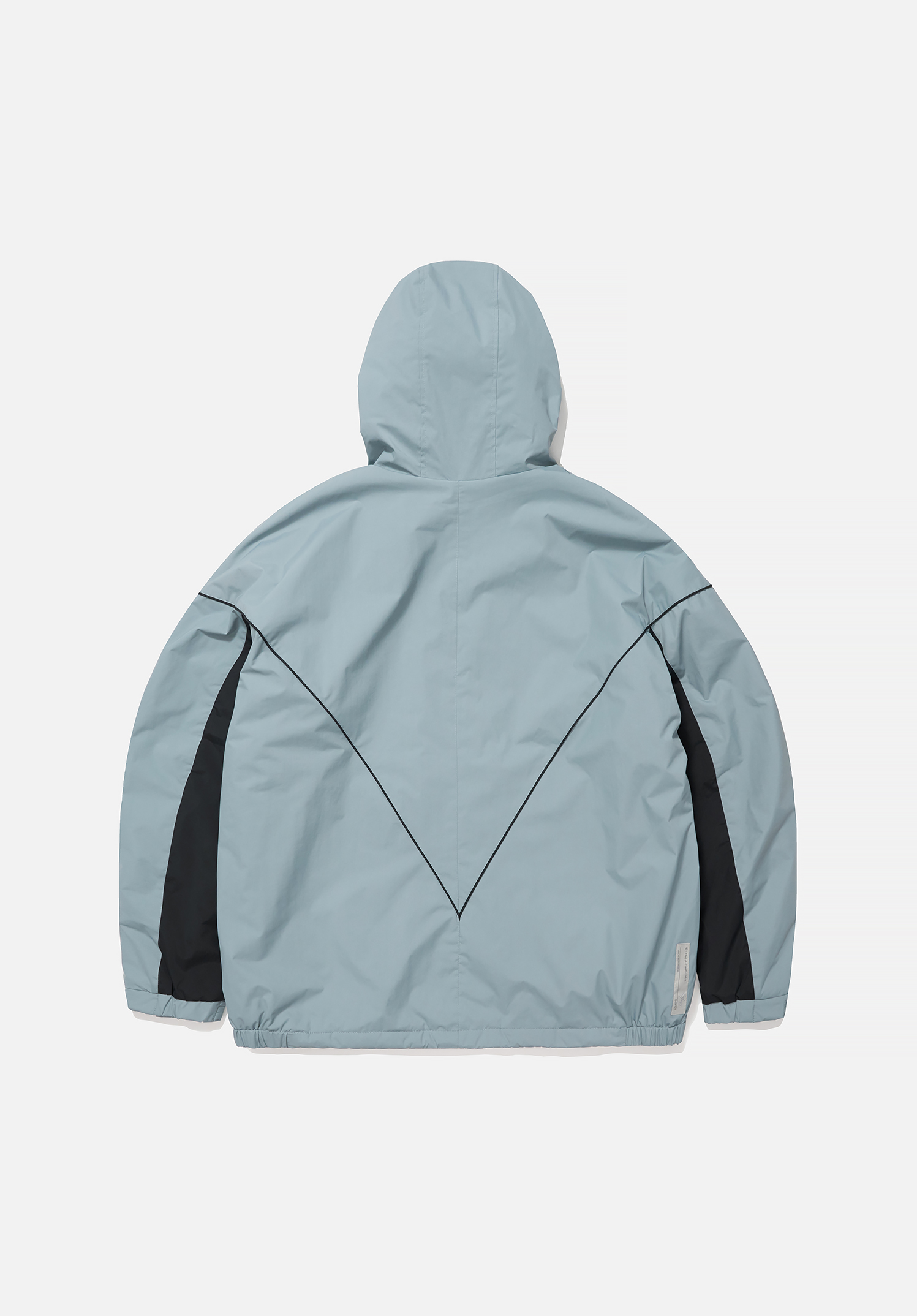 오버핏 실루엣 위에 교차된 파이핑 디테일과 소매 배색이 조화를 이루는 자켓입니다.